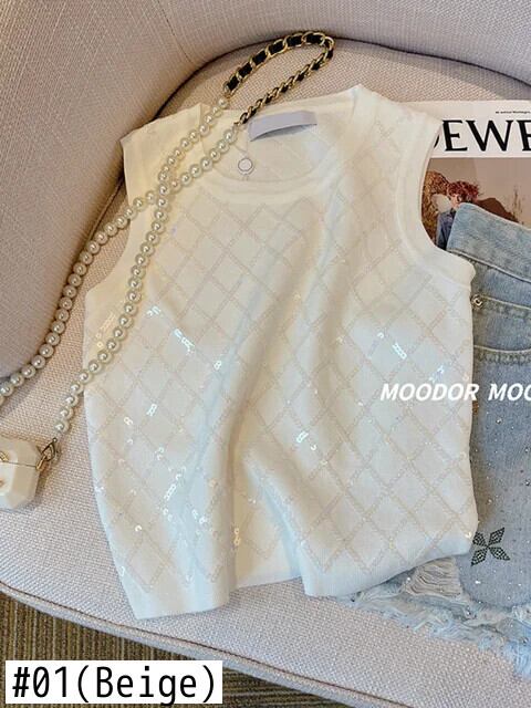 アーガイルスパンコールニットベストプルオーバー 2024 夏 O ネックシックノースリーブセーターベストニットクロップトップスジャンパー サマー 夏物 Oネック