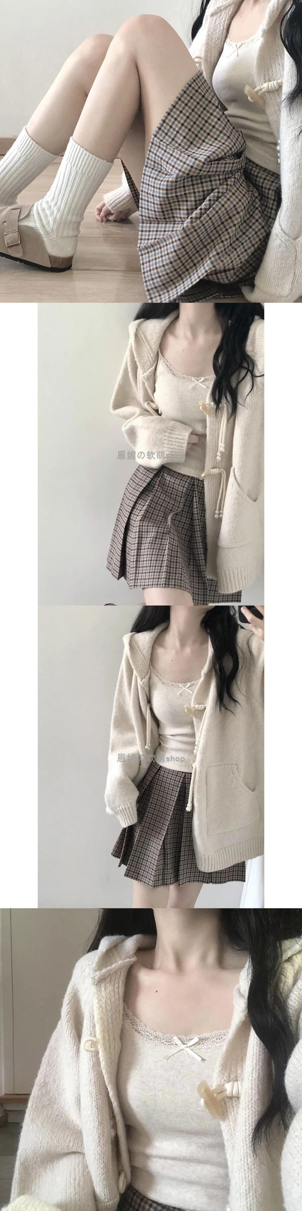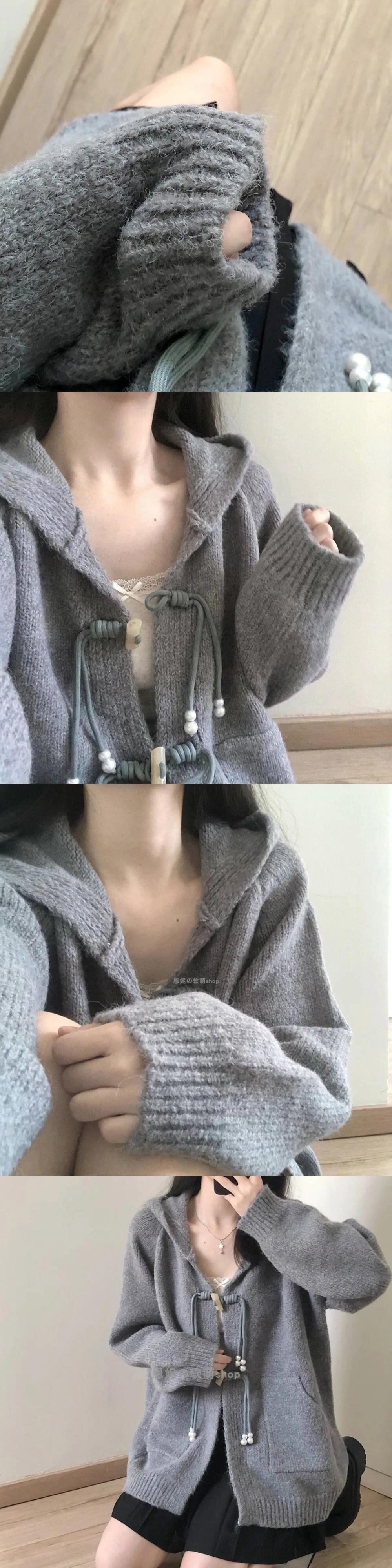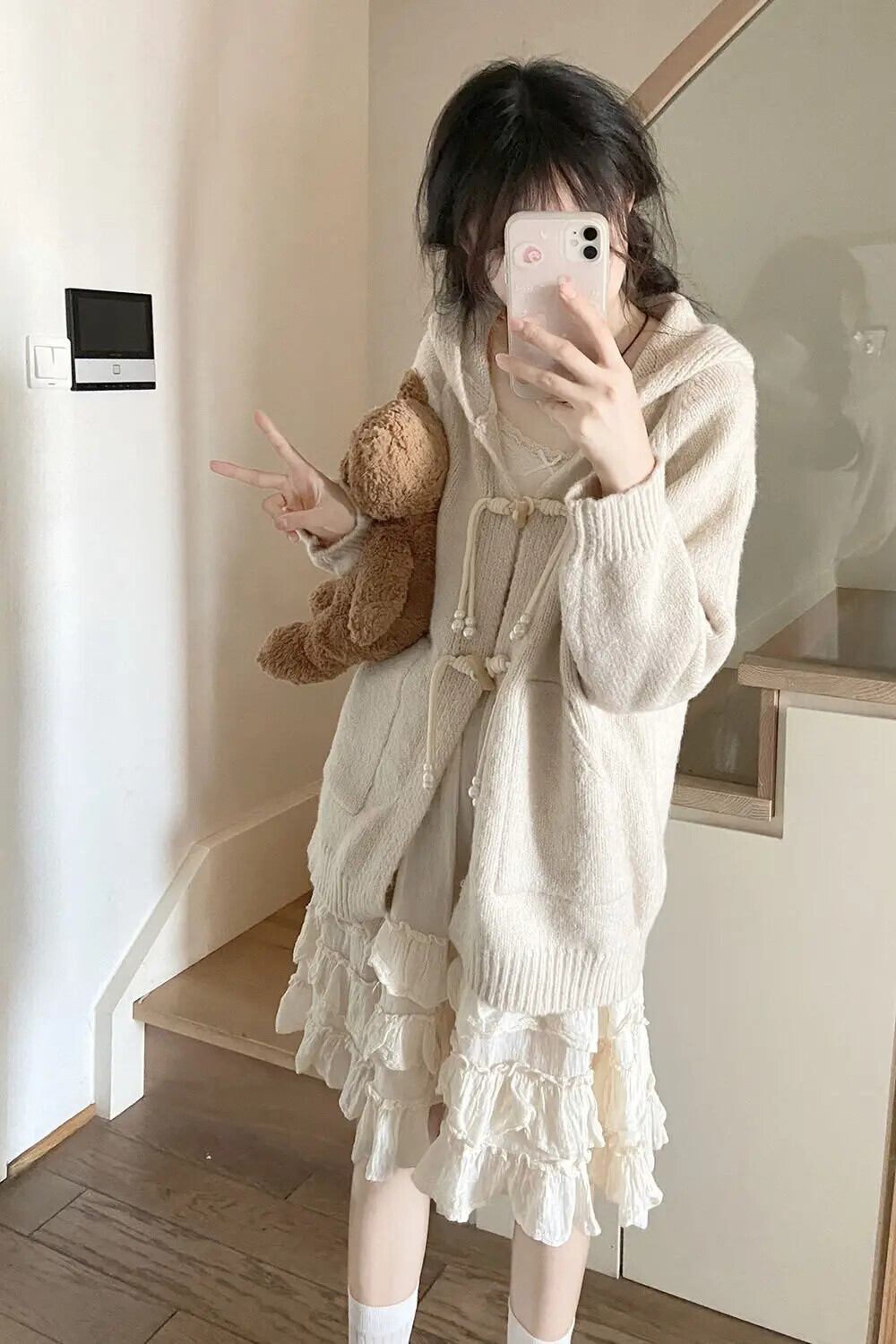 ホーンボタン長袖フード付きカーディガン秋ニットコート Y2k セータートップスセーター特大 ロング オータム 秋物 ソリッドカラー