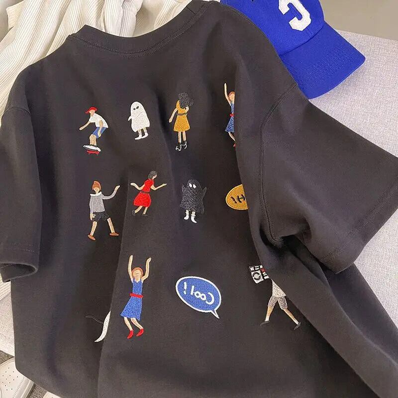 2024 O ネック半袖 Tシャツ夏 Tシャツシック特大トップス漫画刺繍 Y2k Tシャツ Ropa ショート ハーフスリーブ サマー 夏物 Oネック