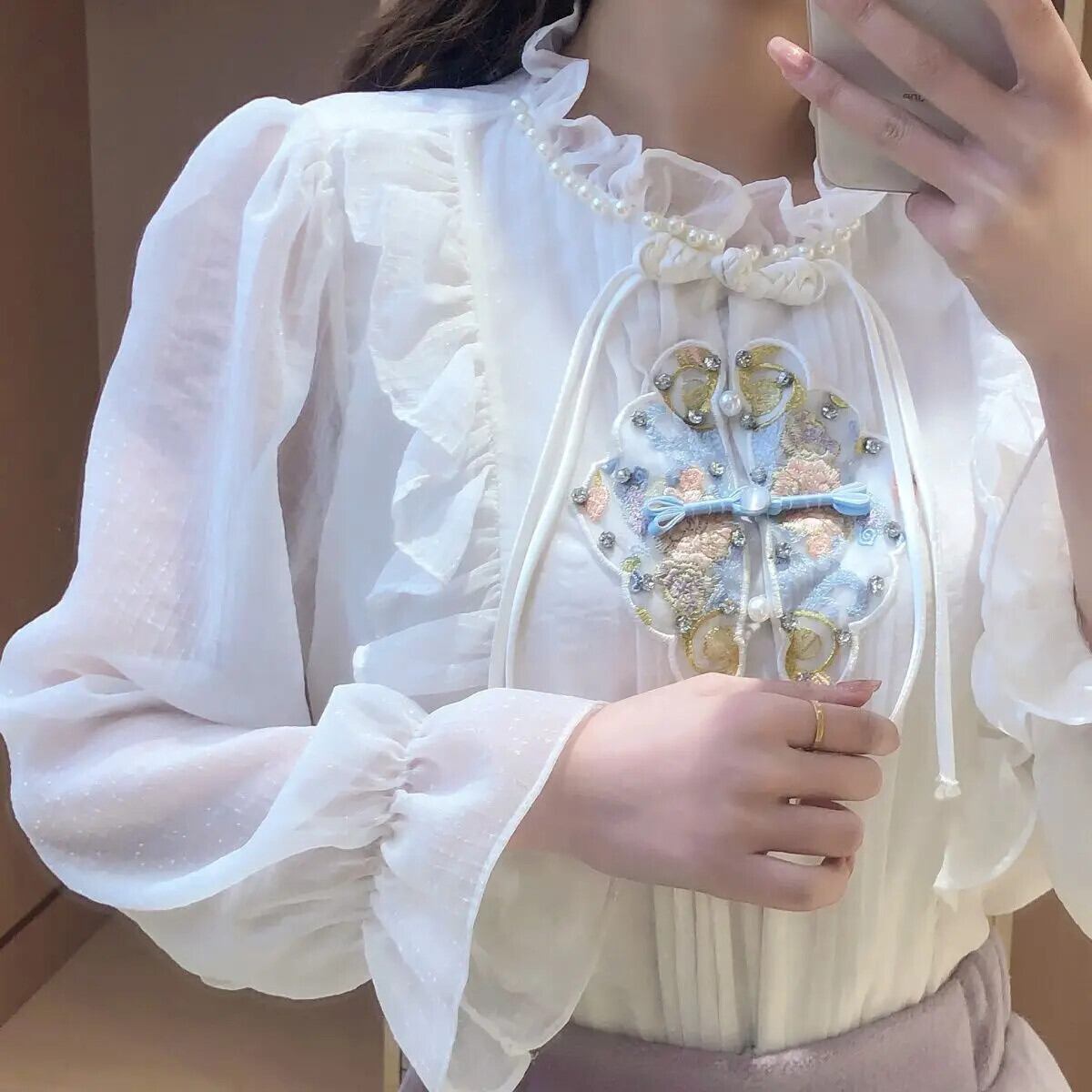 ヘビービーズ刺繍ボタンフリルエッジ長袖シャツブラウストップス s es ロング