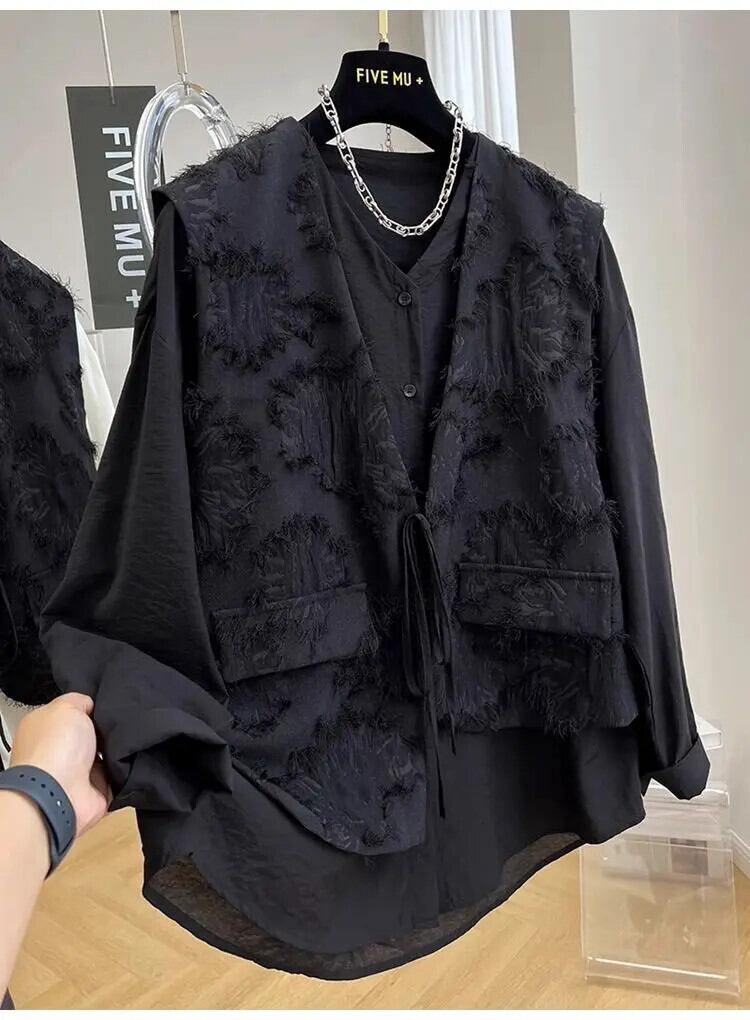 ルーズパッチワークフェイクツーピース長袖 V ネックシャツ薄いジャケットトップ黒ジャカード Tels ベスト Chaleco ロング ブラック Vネック