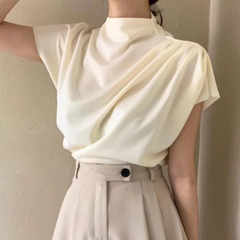 気質プリーツパッチワークバットスリーブハーフカラーシャツデブラックブラウストップスショートサマー 夏物