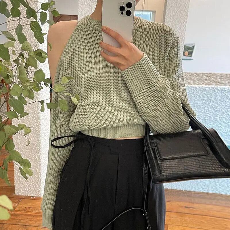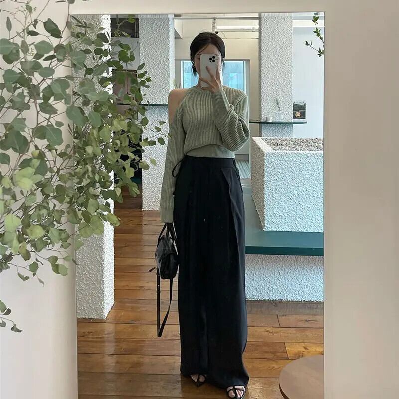 プルオーバーオフショルダースタイル気質セータージャージトップスプルセータージャンパーブラックホワイトシャツ