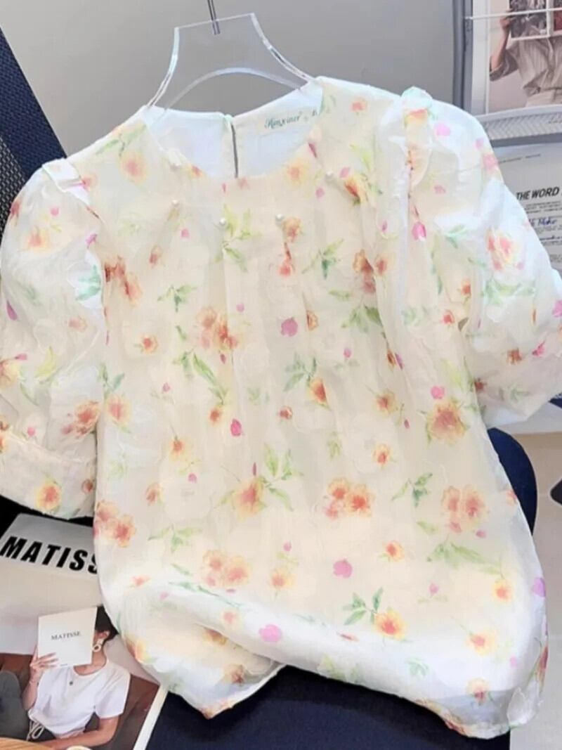 ショートフラワースタッズビーズプリーツスリーブシフォンシャツ es ブラウス夏クロップトップシャツ サマー 夏物 フラワーデザイン