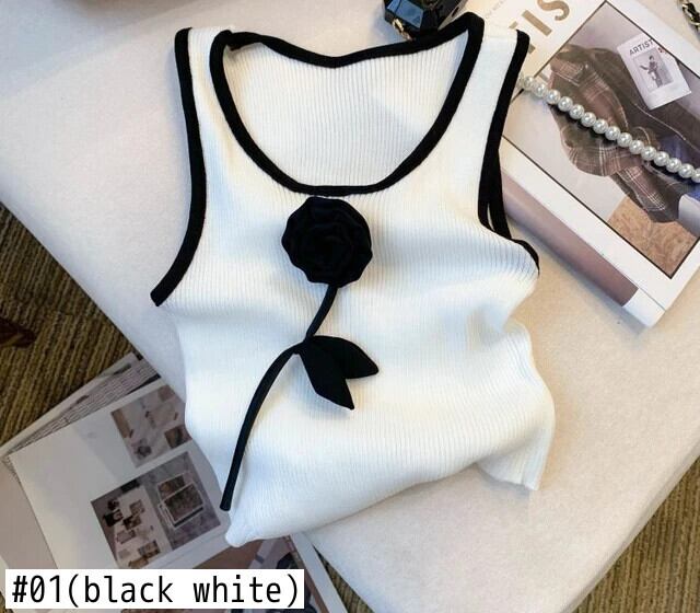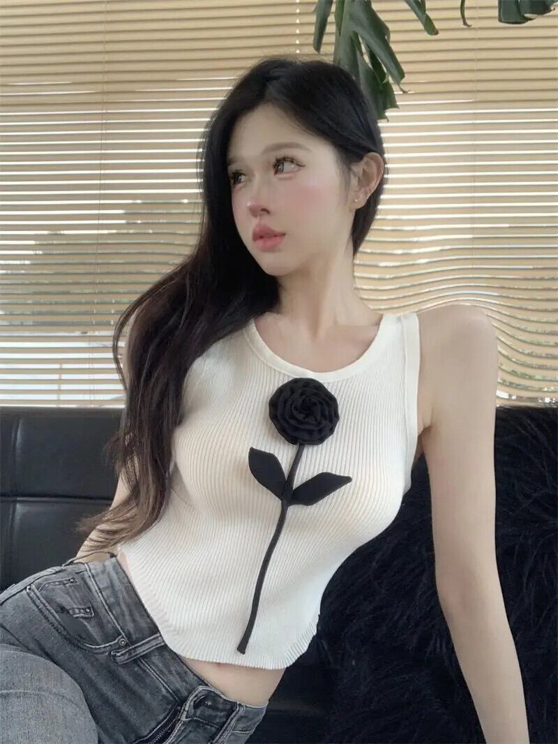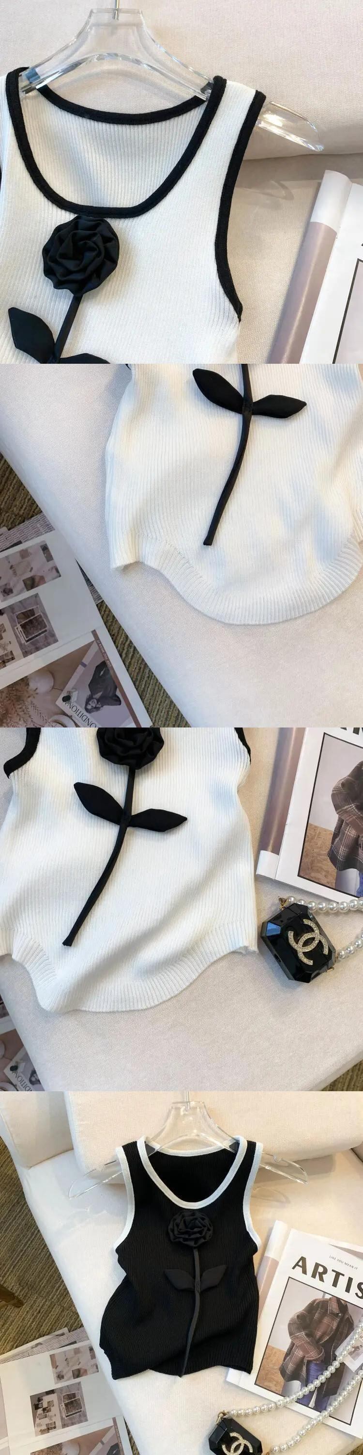 かわいいユニーク立体フラワースリムフィットノースリーブアイスニットホルタートップタンクキャミソール 大人ガーリー スウィート キュート カジュアル シルク フラワーデザイン