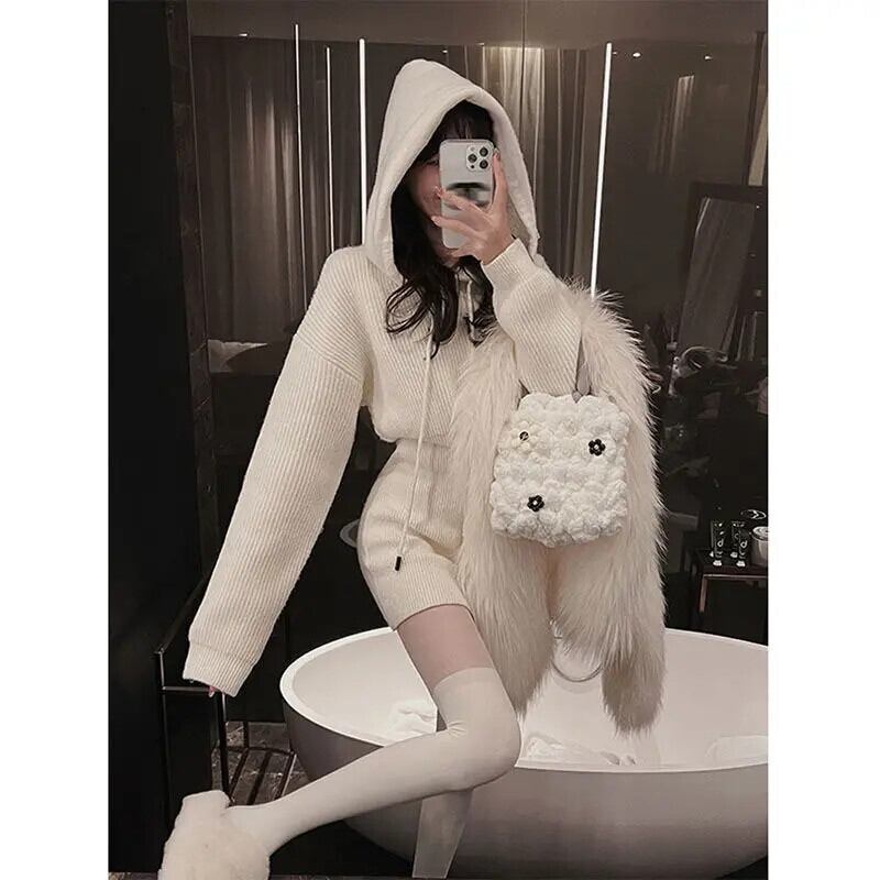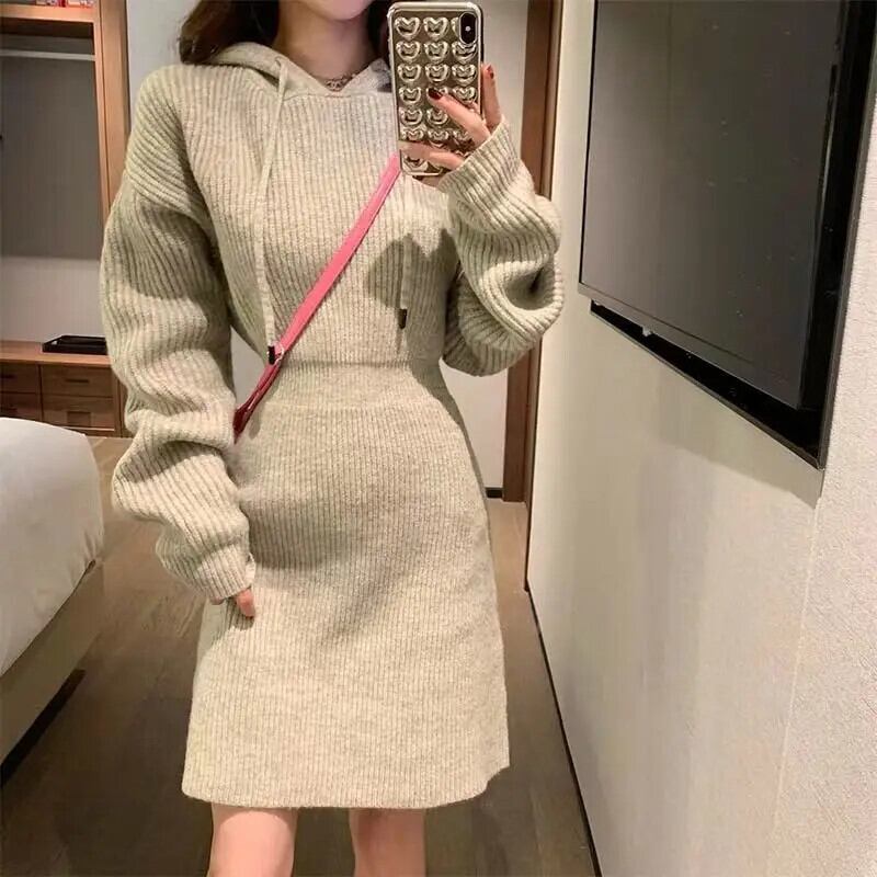 セクシー Y2k シックグレーニットドレス因果秋黒ウエスト気質ボトムタイトフード付きセータードレス ブラック オータム 秋物