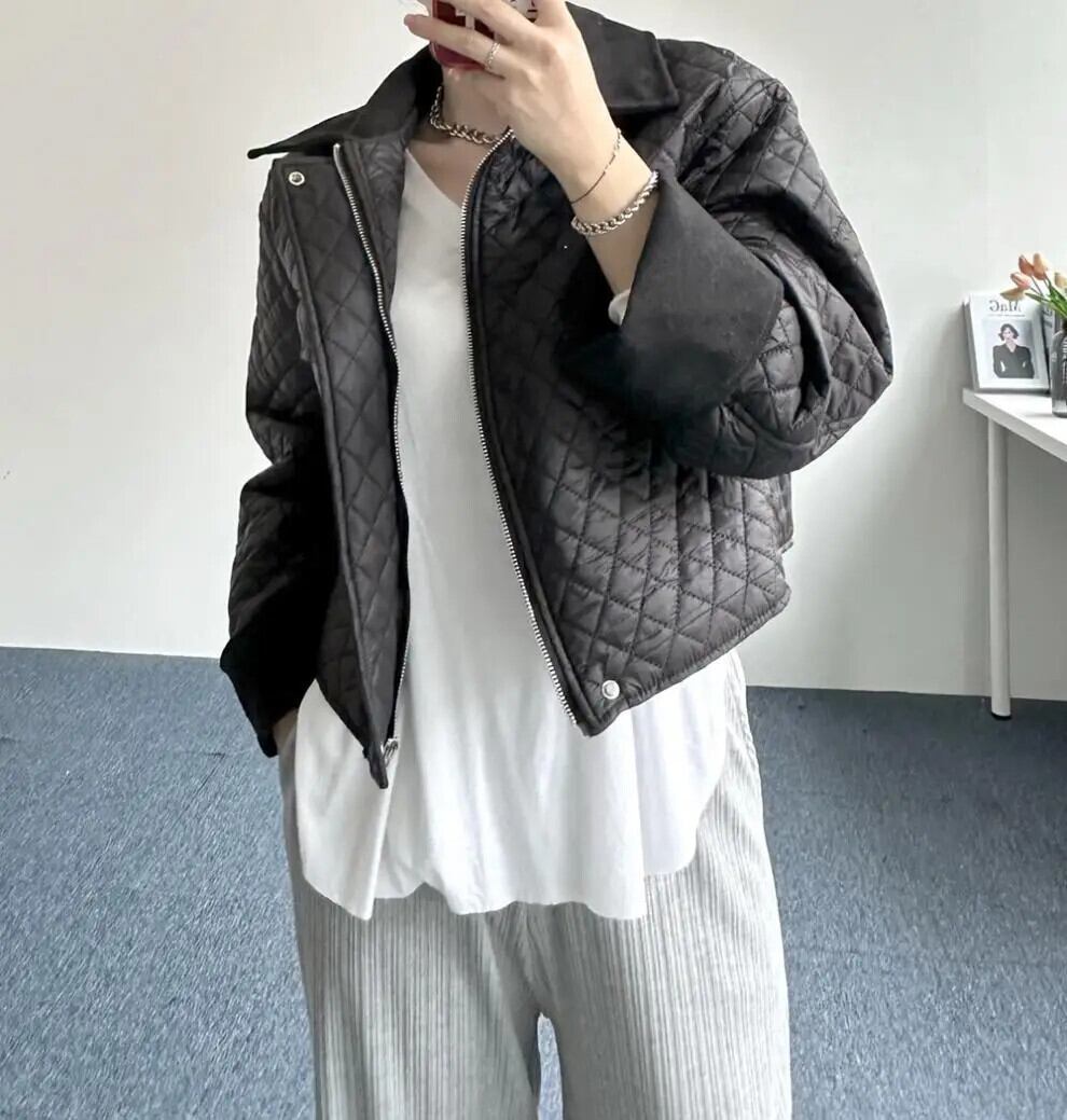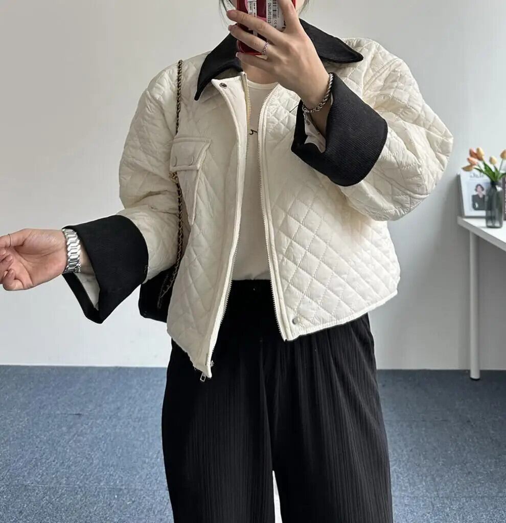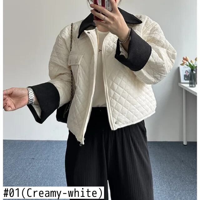 フグジャケット冬 Roupas コントラスト暖かいアーガイル綿ラペル黒パーカー軽量トップ ブラック コットン ウィンター 冬物