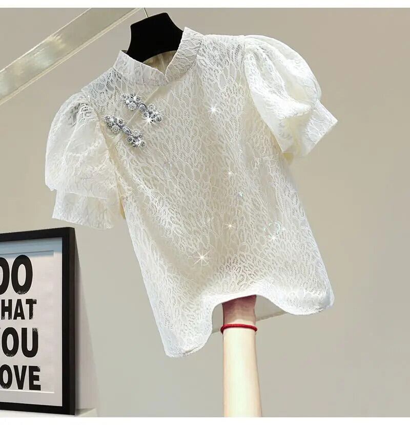 レトロひだパフスリーブスタンドカラーフックフラワーシャツアウトレースブラウススタイルシック Blusa フラワーデザイン