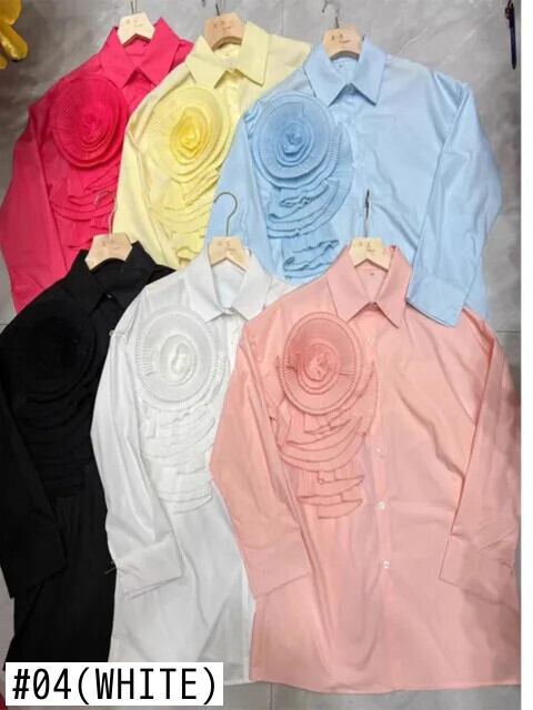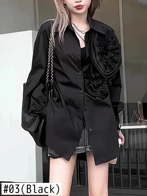 春秋シャツ 3D 花ターンダウンカラートップ甘いオフィス長袖ブラウス ロング 大人ガーリー スウィート キュート カジュアル スプリング 春物 オータム 秋物 ソリッドカラー フラワーデザイン 会社 学校 通勤や通学にも