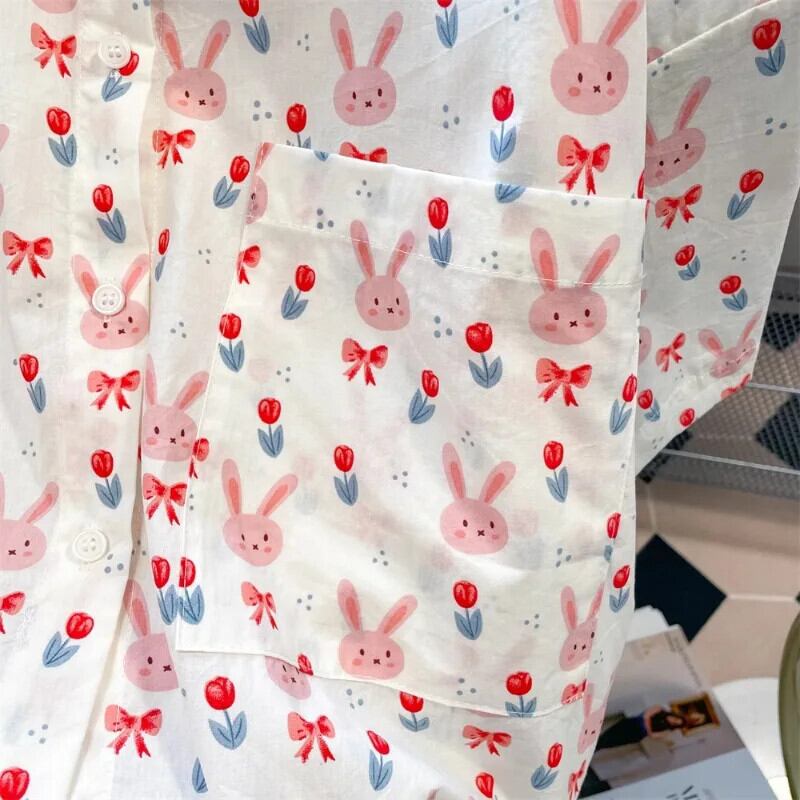 夏スウィートラビットプリントシャツ日焼け止め半袖トップブラウス s Y2k ese シャツ ショート ハーフスリーブ 大人ガーリー キュート カジュアル サマー 夏物