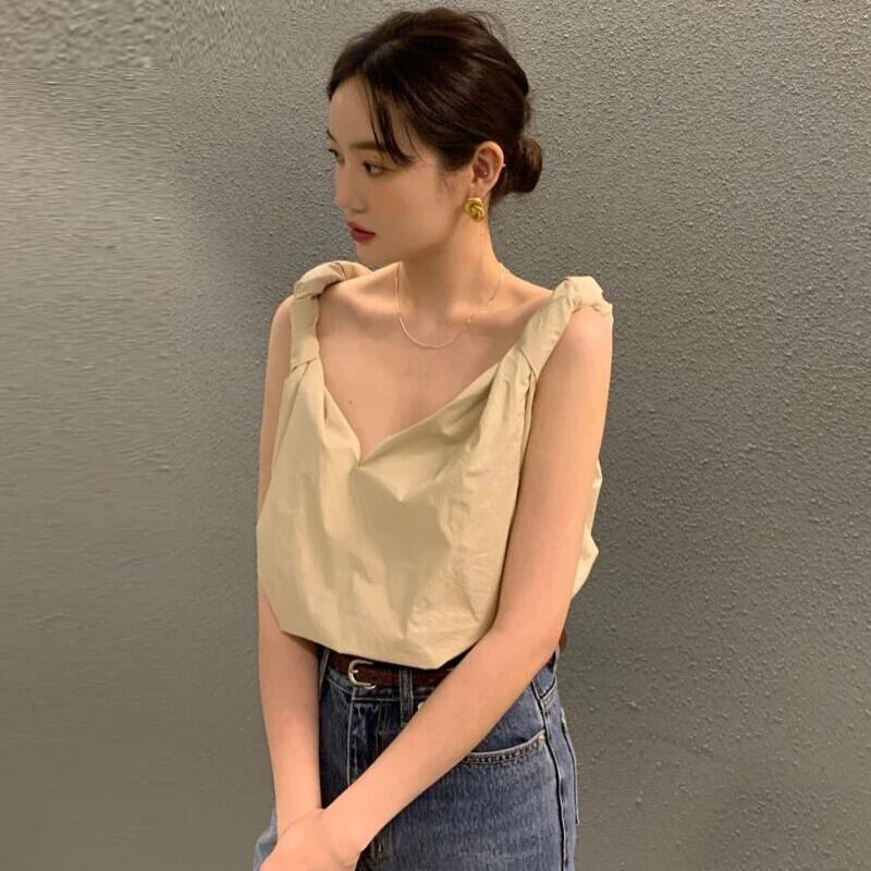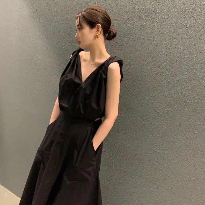 セクシータンク & キャミソールブラウスデモーダ 2024 夏ソリッドカラーノースリーブキャミソール黒シャツクロップトップス ブラック サマー 夏物