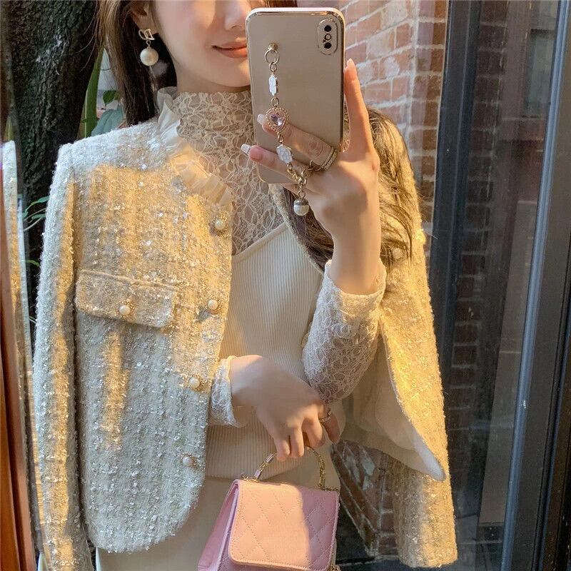 シックキラキラスパンコールショートコート 2024 秋ジャケット長袖 O ネック生き抜くカーディガントップ ロング オータム 秋物 Oネック