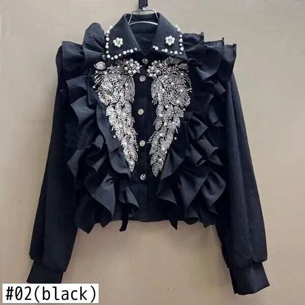ヘビービーズスパンコールウィングシャツ 2024 ラペルネック黒ブラウス Y2k 長袖フリルショートトップ ロング ブラック ラッフル