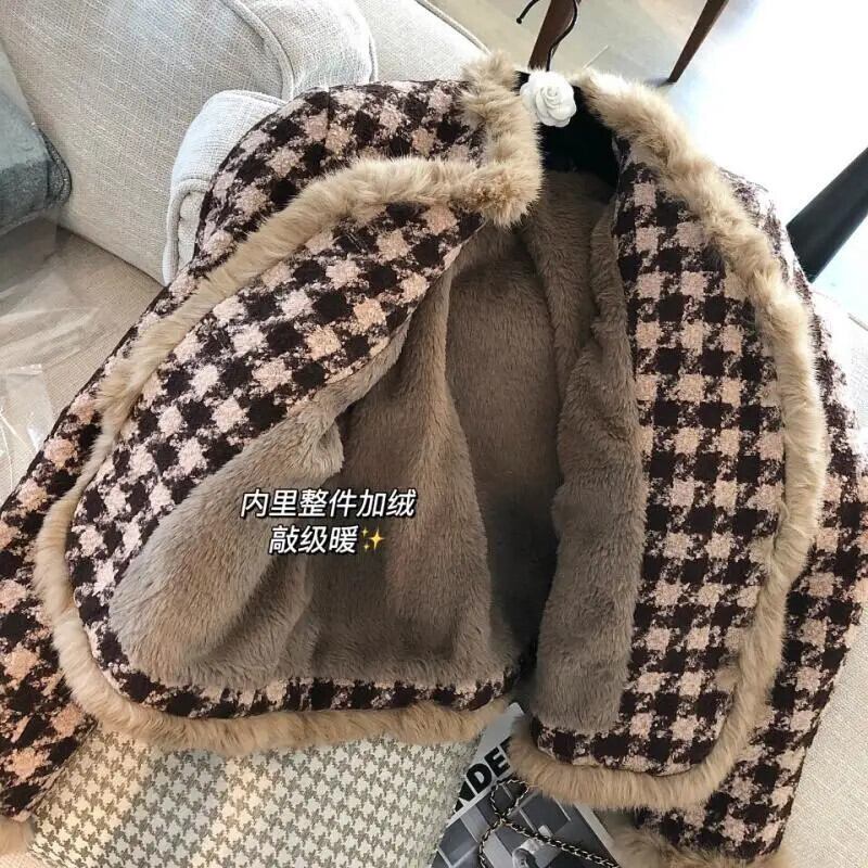フリースチェック柄ツイードジャケットフェイクファーパッチワーククロップドコート冬ベルベット厚く暖かいショートアウター ウィンター 冬物