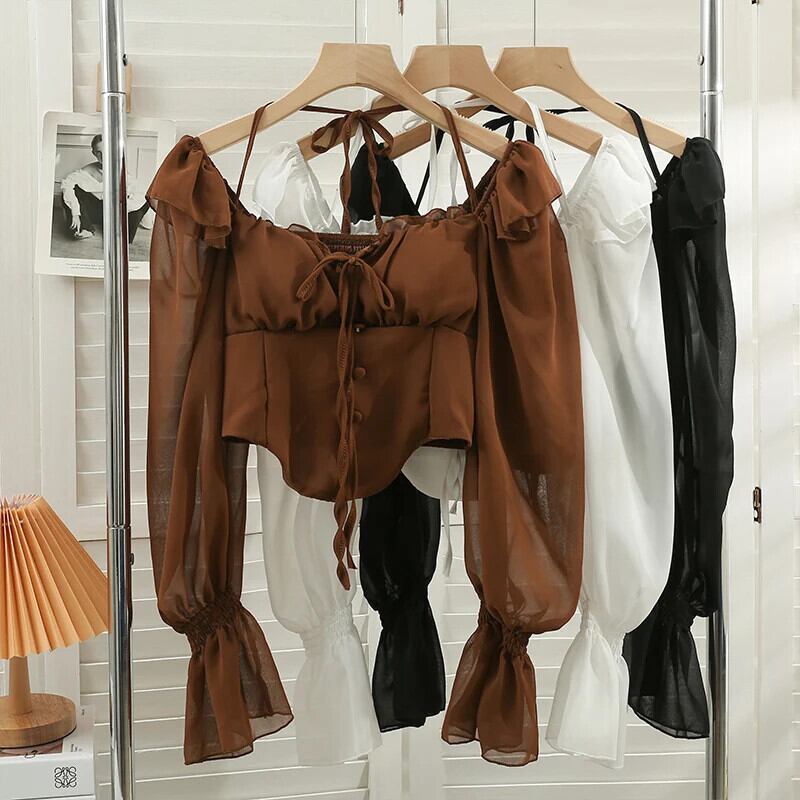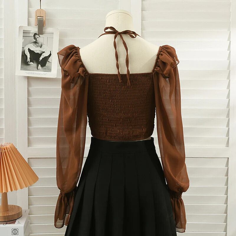 フレンチシックホルターブラウス s ボウフレアスリーブショートトップスレディースストリート Blusa シャツ送料 リボン
