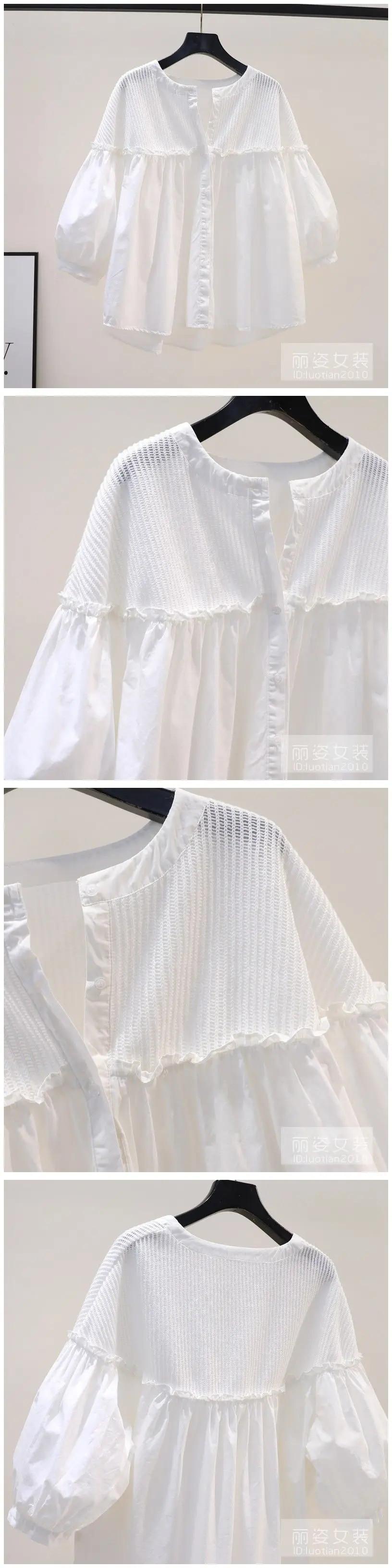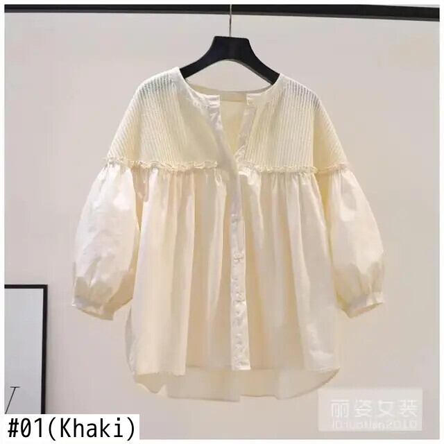 デモーダ綿ブラウスパッチワークピンクシャツ緩い夏甘いフリルブラウス O ネックランタンスリーブトップス コットン ラッフル 大人ガーリー スウィート キュート カジュアル サマー 夏物 Oネック