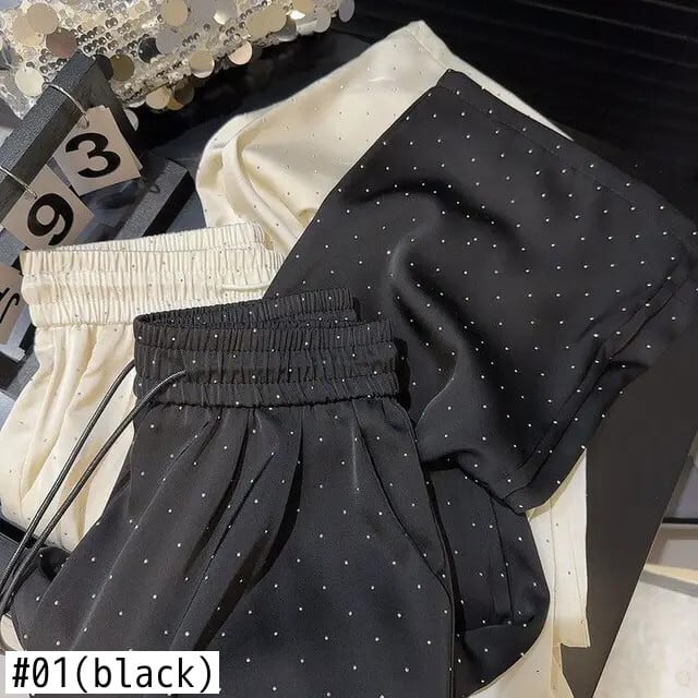弾性ウエストストレート脚ルーズフロアモップ Pantalones ズボンスウェットパンツ黒水玉パンツサテン ブラック エラスティック 伸縮