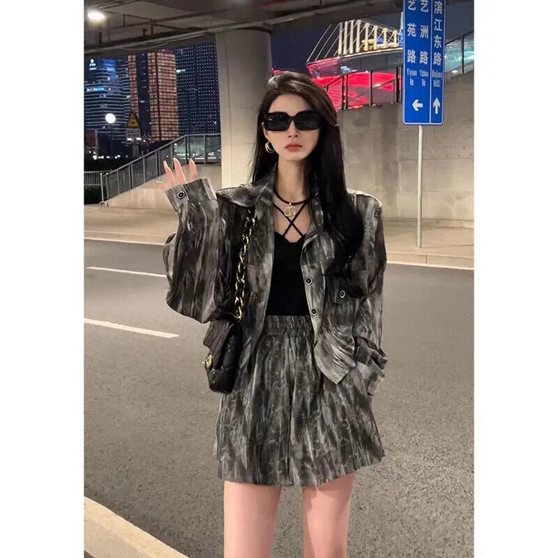 タイダイジャケット長袖ショートシャツウエストショーツ 2 点セットレディース衣装 Y2k クロップトップスーツ Ropa コート ロング ブルマー