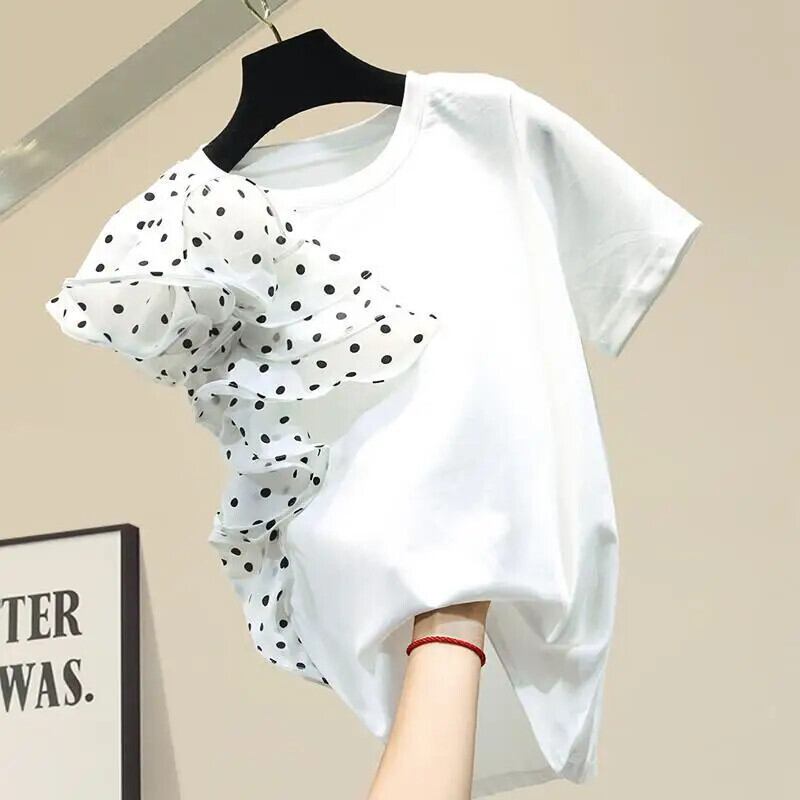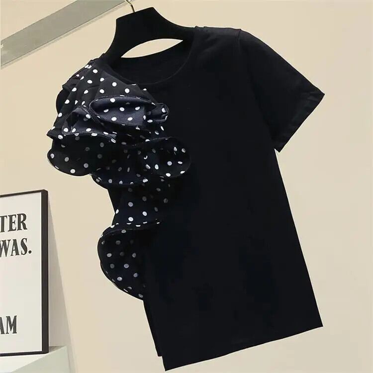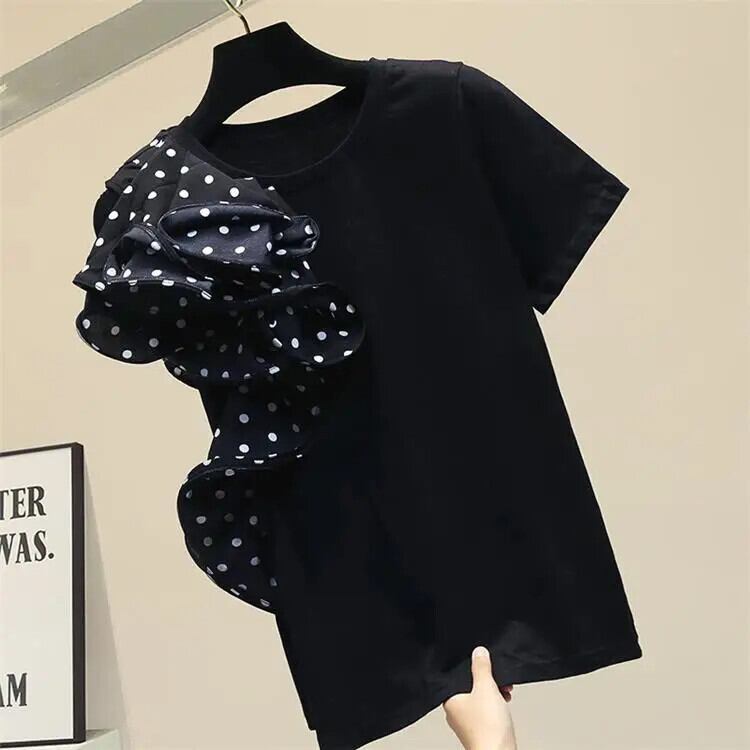 パッチワークピュアコットンブラックホワイトポルカドット Tシャツ Ropa 2024 シャツグラフィック T ルーズ Tシャツ