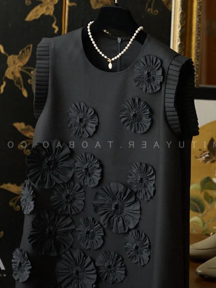 Vestidos De Temperament アップリケ プリーツ フラワー フライ スリーブ スモール ブラック ドレス Y2k ローブ ストリート フラワーデザイン