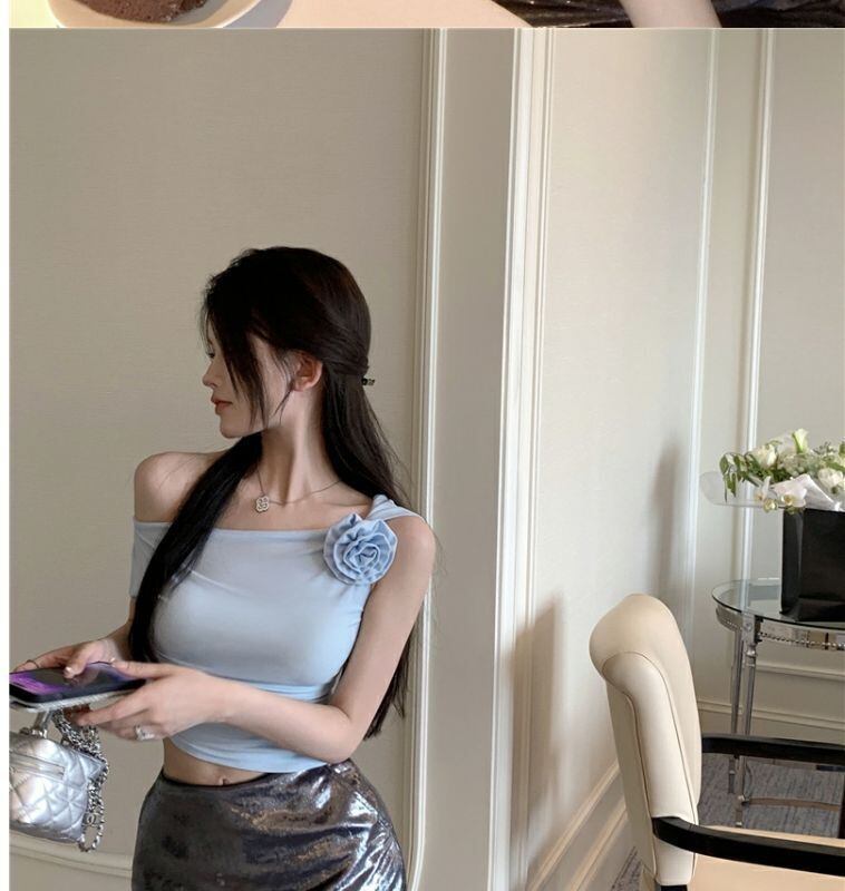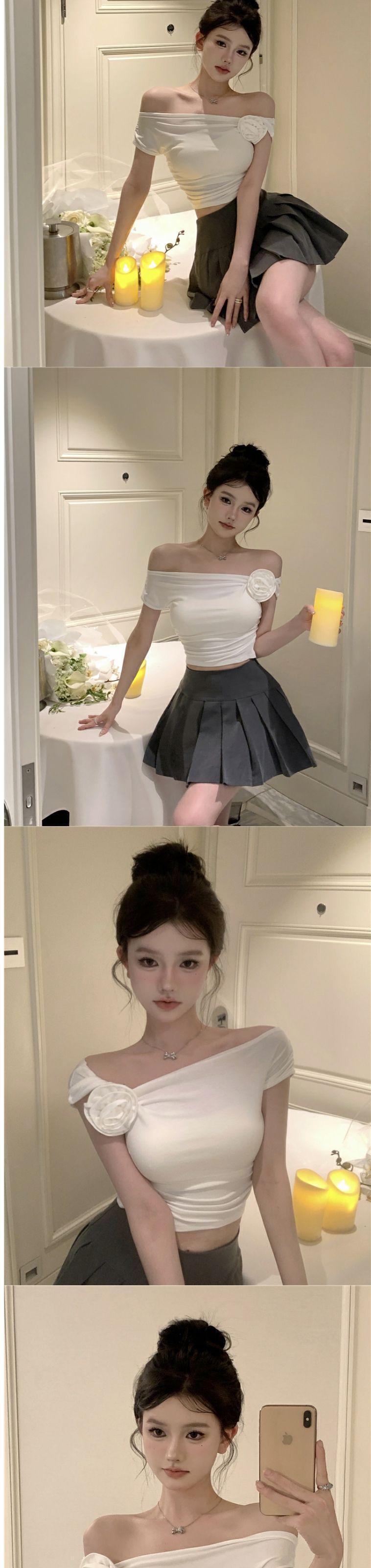 3D 花オフショルダープリーツブルートップクロップ 1 セクシースリム 2024 シャツ夏 Tシャツ白 Tシャツ ホワイト サマー 夏物 花柄 ソリッドカラー