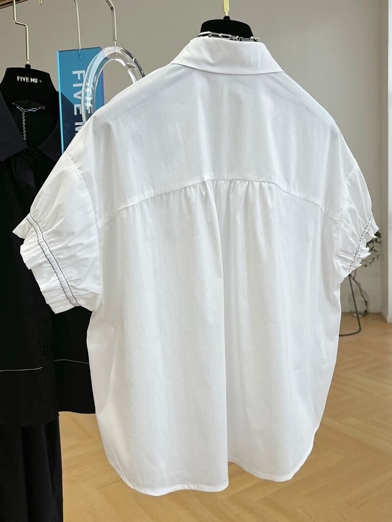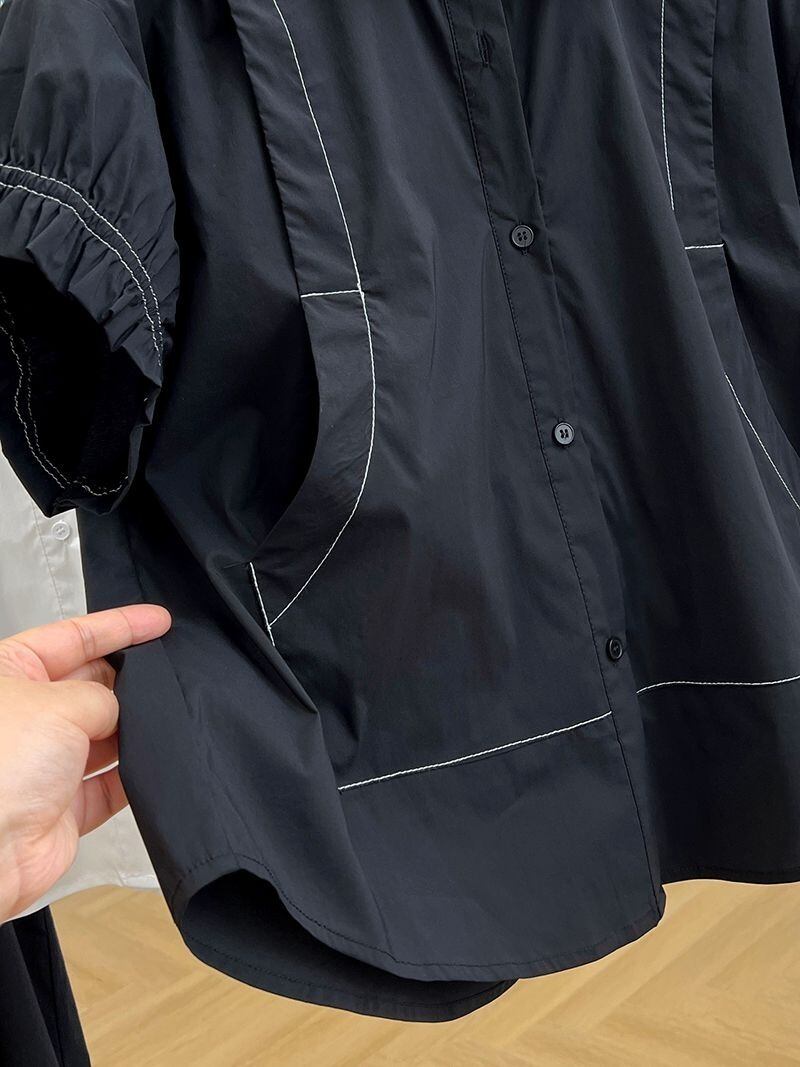 De Moda 2024 半袖ブラウスブラックホワイトルーズシャツボタンプリーツストライプシャツ ショート ハーフスリーブ