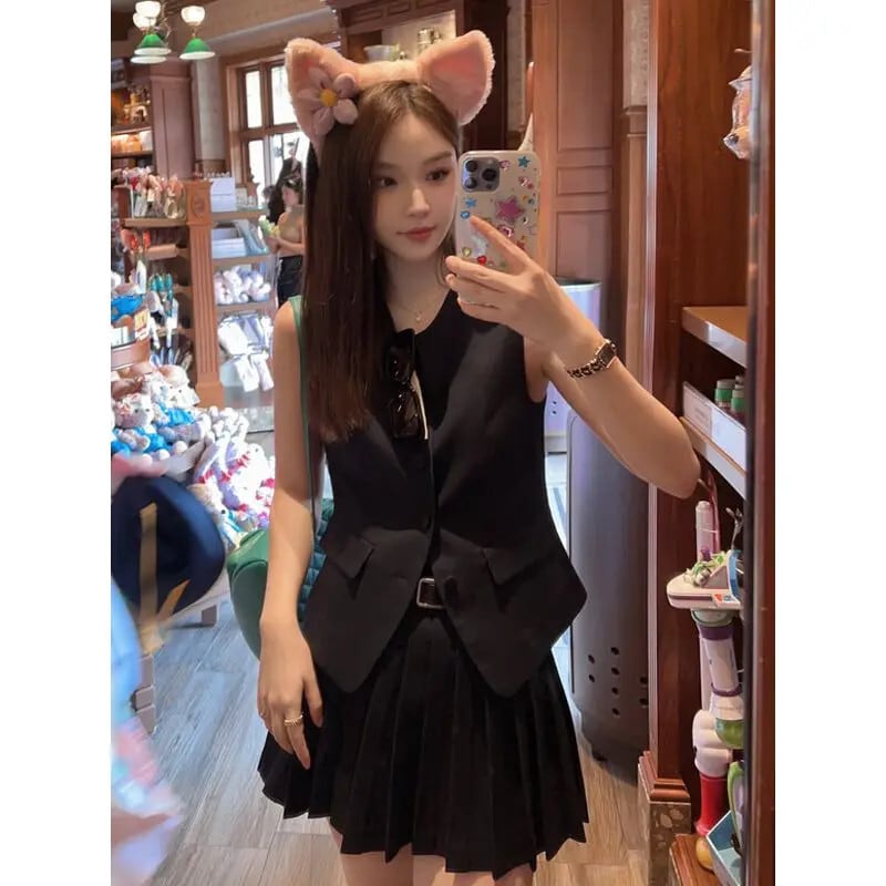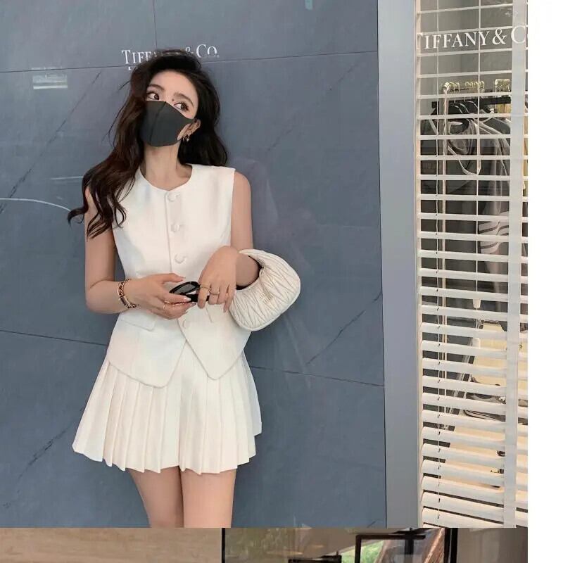 夏ソリッドカラー衣装 2 ピーススカートセットノースリーブシングルブレストトップスミニプリーツスカート サマー 夏物