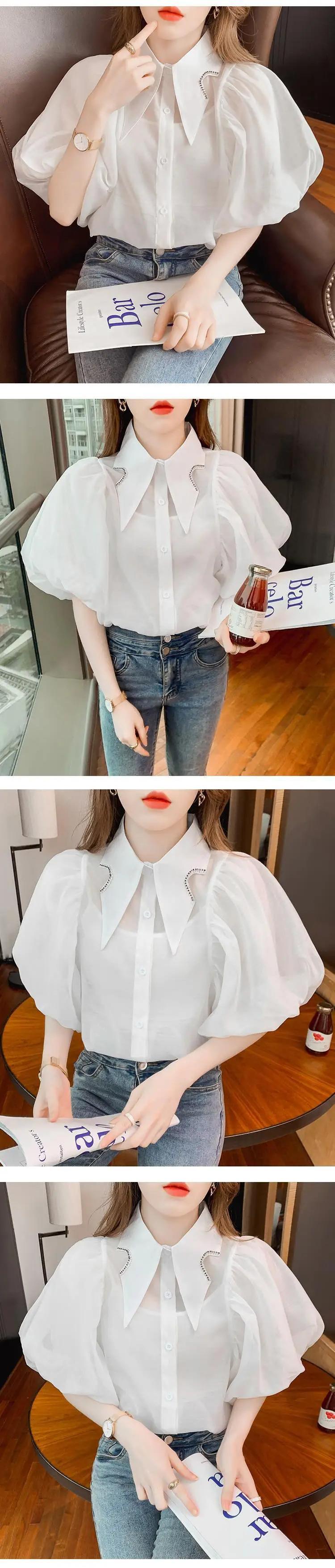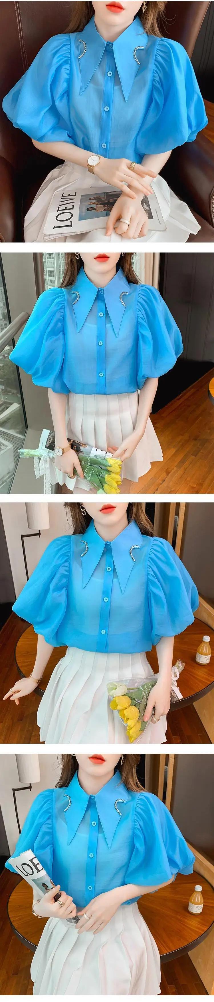 スタイルビーズラインストーン尖った襟パフスリーブシフォンシャツ 2024 夏ショートブラウストップス サマー 夏物