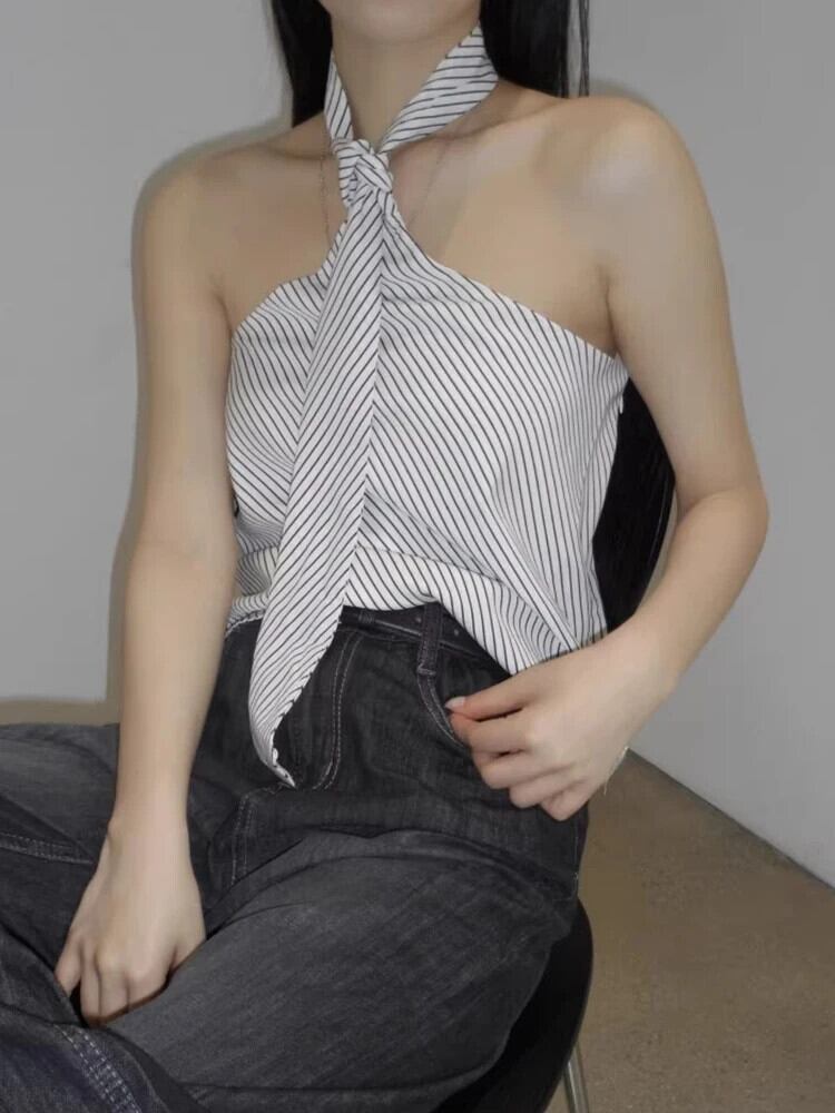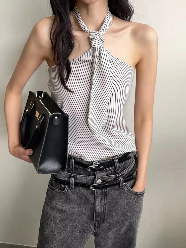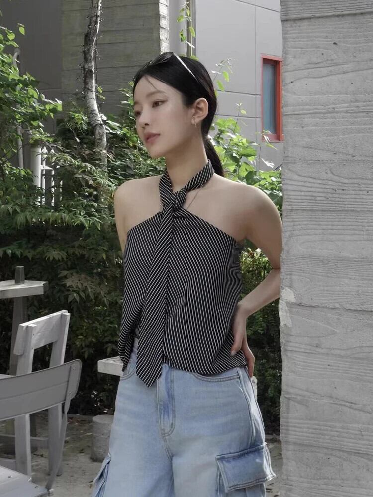 リボン痩身ノースリーブストライプベストタンクトップ黒ロパデセクシーホルターキャミソール ブラック