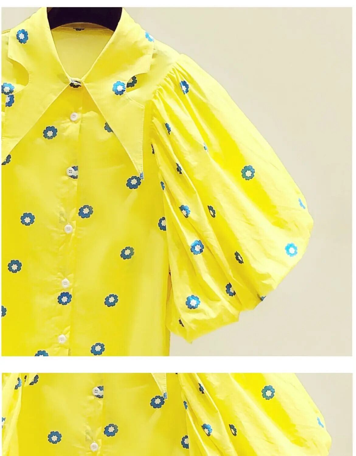 ブラウス夏 2024 プリントバブルスリーブネックショートルーズフィットシャツトップスシックシャツ サマー 夏物