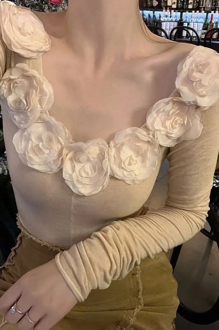 Ropa De シャツ 2024 スリムニットトップス V ネック 3D 花 Tシャツピンクセーター甘い 大人ガーリー スウィート キュート カジュアル 花柄 Vネック