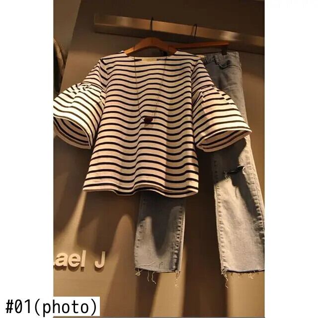 学生ルーズフレア袖ラウンドネックトップハーフストライプシャツ 2024 夏グラフィック T Y2k Tシャツ レッド サマー 夏物 Oネック
